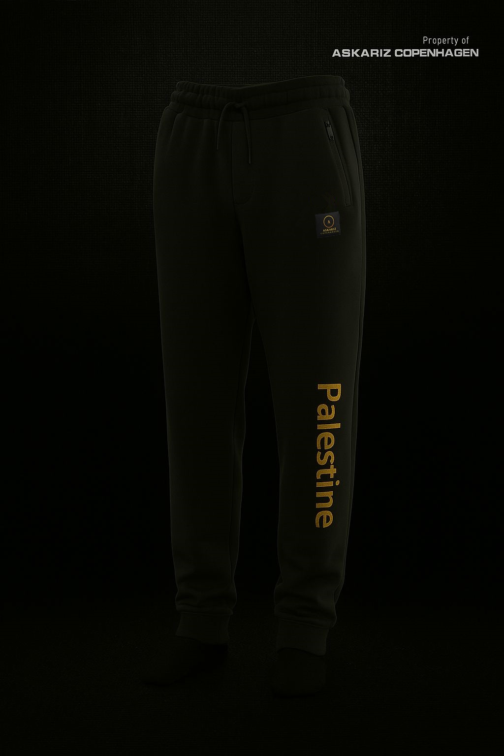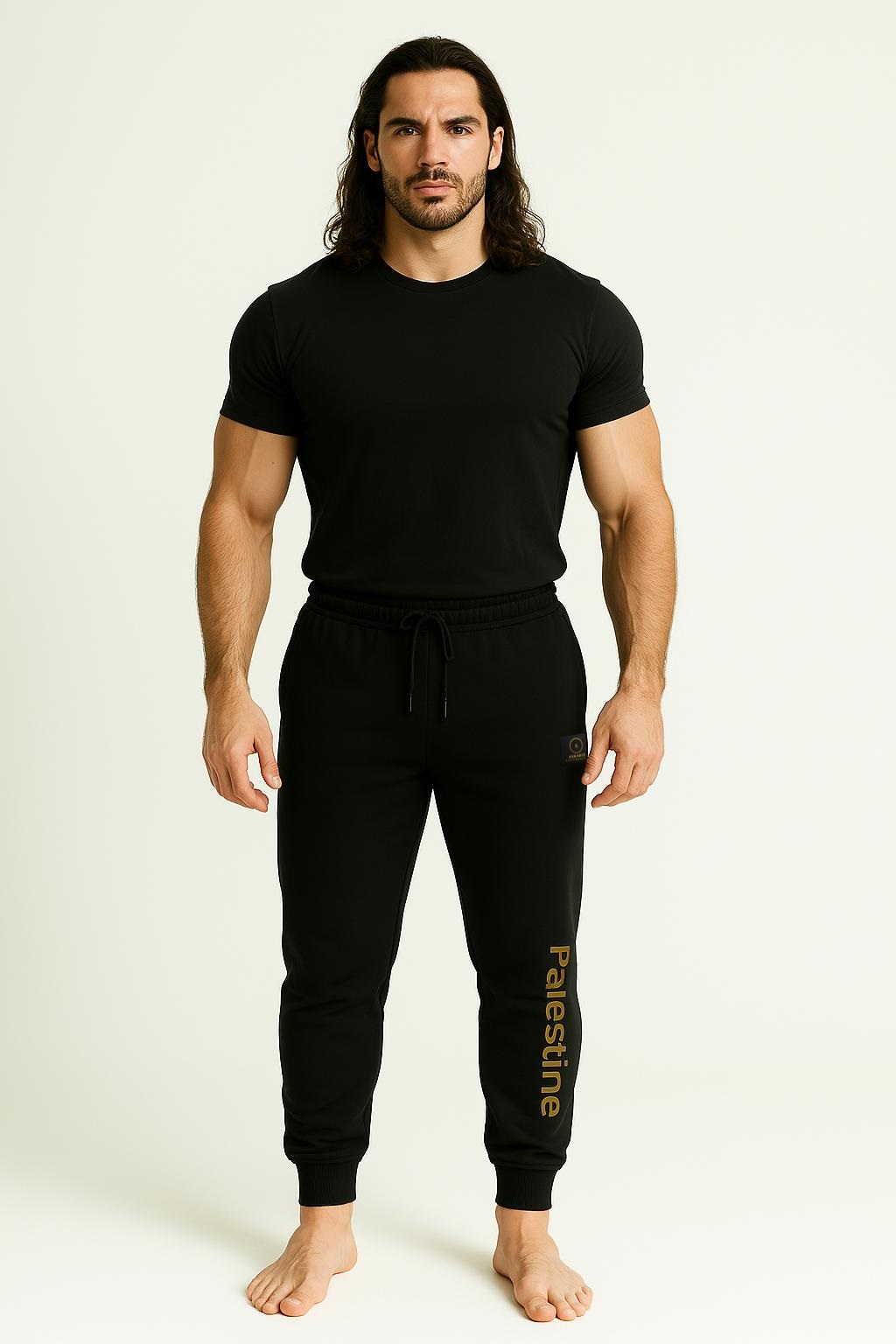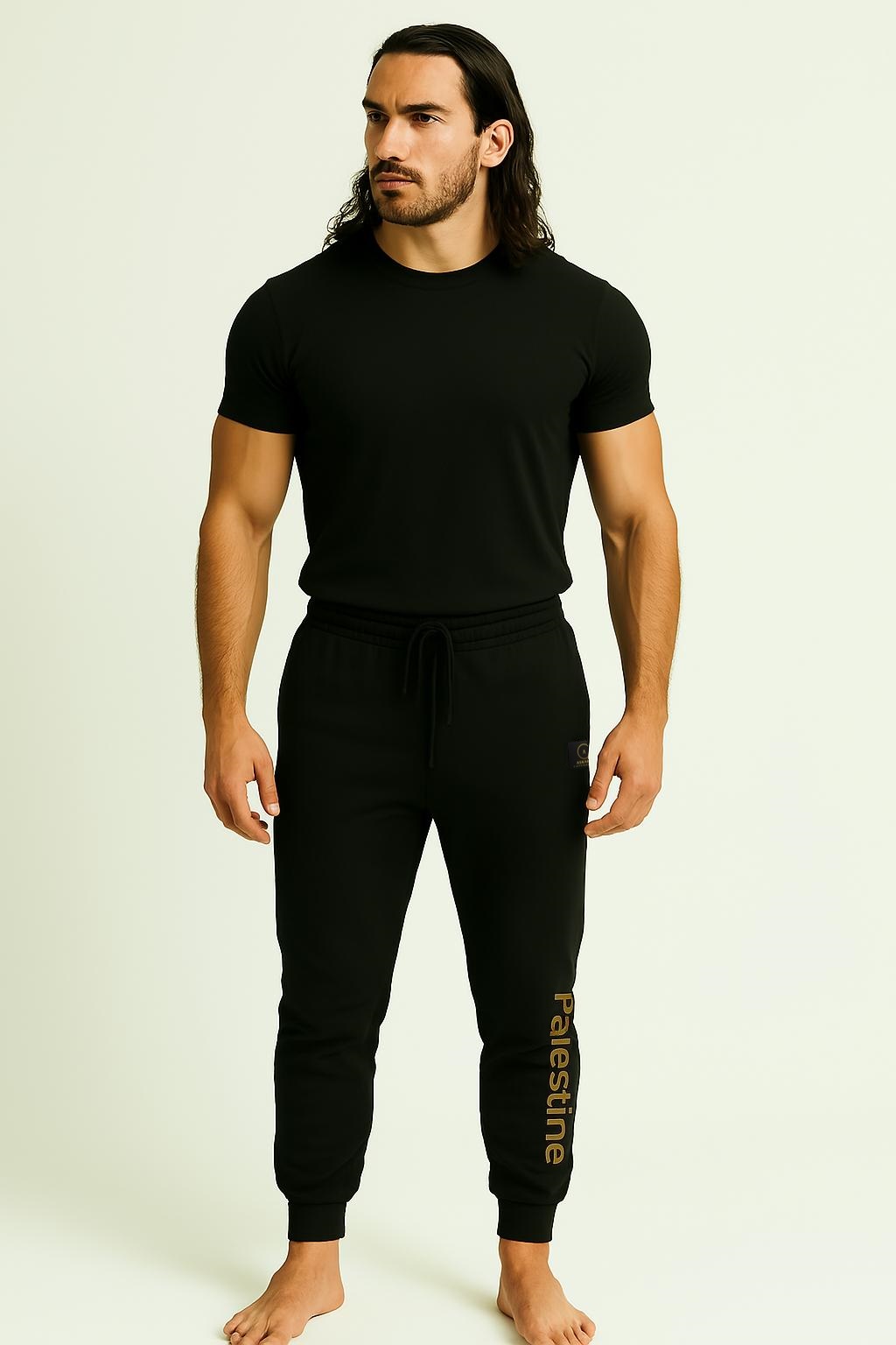 Beskrivelse: Palestine Pyjama - Sort Palestine Pyjama Set – Black Elevate your loungewear with our sleek and comfortable Palestine Pyjama. Crafted from soft, breathable fabric. Designed for both comfort and style, the pants include an elastic waistband with an adjustable drawstring for a perfect fit, and a bold vertical “Palestine” print in gold down the left leg—making a subtle yet powerful statement. Whether you’re relaxing at home or unwinding after a long day, this pyjama offers the perfect blend of meaning, comfort, and modern design. • Color: Black with gold detailing • Fit: Regular • Material: Soft cotton blend • Elastic waistband with drawstring • Printed “Palestine” detail on leg • Unisex design • Askariz logo below right side pockets